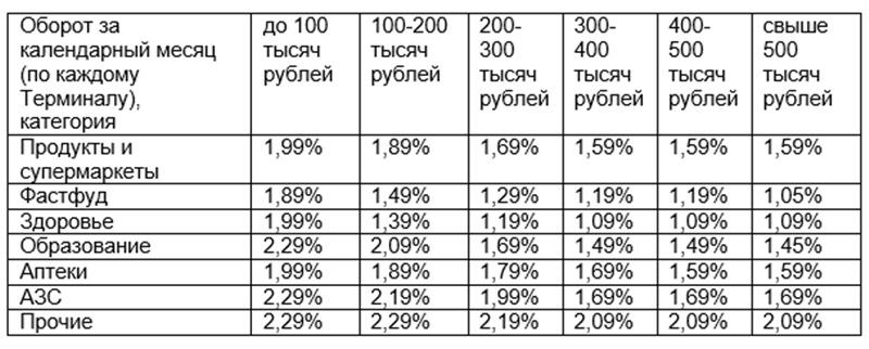 В первый календарный месяц после окончания срока действия акционного тарифа, а также в первый и второй календарные месяцы установки терминала действует ставка, соответствующая максимальному значению оборота и категории по нижеуказанной таблице. По истечении указанного срока размер процента устанавливается на каждое второе число месяца исходя из оборота и категории за предыдущий месяц в соответствии с нижеуказанной таблицей: