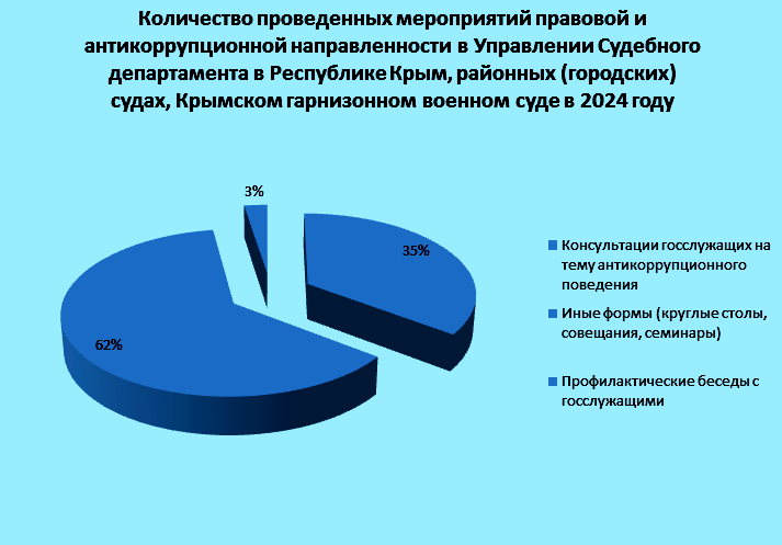 Управлением Судебного департамента в Республике Крым, а также районными (городскими) судами Республики Крым и Крымским гарнизонным военным судом, в 2024 году проведено 120 мероприятий правовой и антикоррупционной направленности: 42 консультации госслужащих на тему антикоррупционного поведения, 74 мероприятия в иной форме (антикоррупционный инструктаж с гражданами, поступающими на госслужбу, совещания, круглые столы), одна конференция и три профилактические беседы с госслужащими.