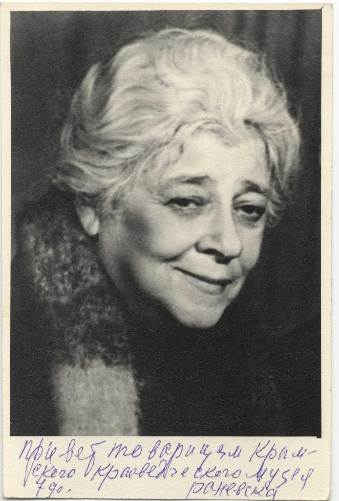 В фондах Центрального музея Тавриды есть 2 фотографии с изображением Фаины Георгиевны Раневской. Одна из них – подлинник с дарственной надписью: «Привет товарищам Крымского краеведческого музея. 79 г. Раневска(я)»; вторая – копийная, на которой (по ее словам, из подписи) она изображена в период работы в Крыму.