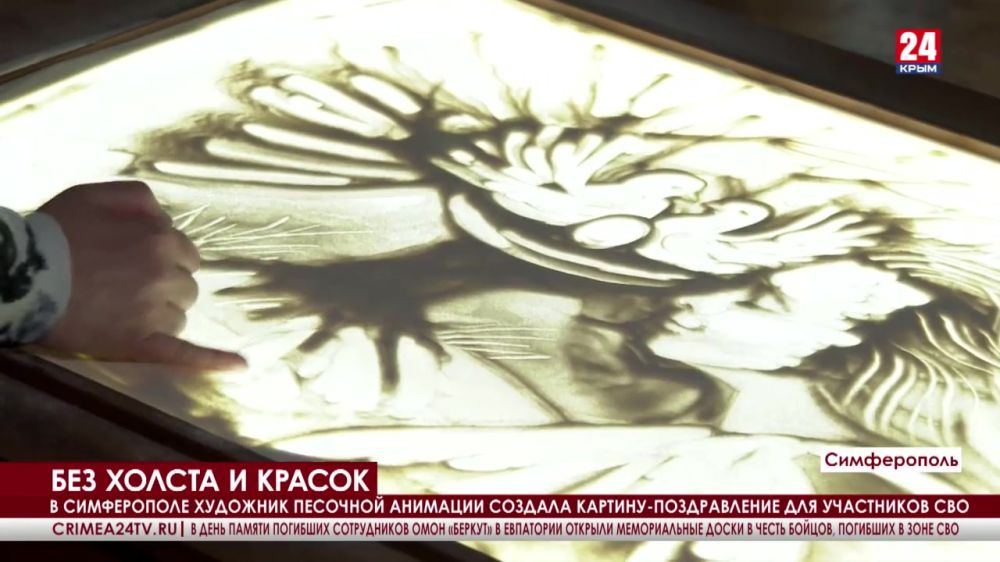 Работник художественного музея Симферополя создала картину-поздравление для бойцов спецоперации - без холста и красок, в технике песочной анимации. Какие инструменты использовала мастер? Об этом, а также о свете, форме и композиции узнала наш корреспондент Раиса Карнович. Она продолжит.