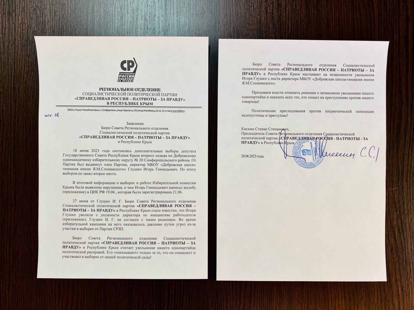28 июня Бюро Совета Регионального отделения Социалистической политической партии "СПРАВЕДЛИВАЯ РОССИЯ – ПАТРИОТЫ – ЗА ПРАВДУ" в Республике Крым выступило с заявлением по поводу увольнения Глушко Игоря Геннадьевича с поста директора МБОУ "Добровская школа-гимназия имени Я.М.Слонимского", после его участия в довыборах в Госсовет Крыма.