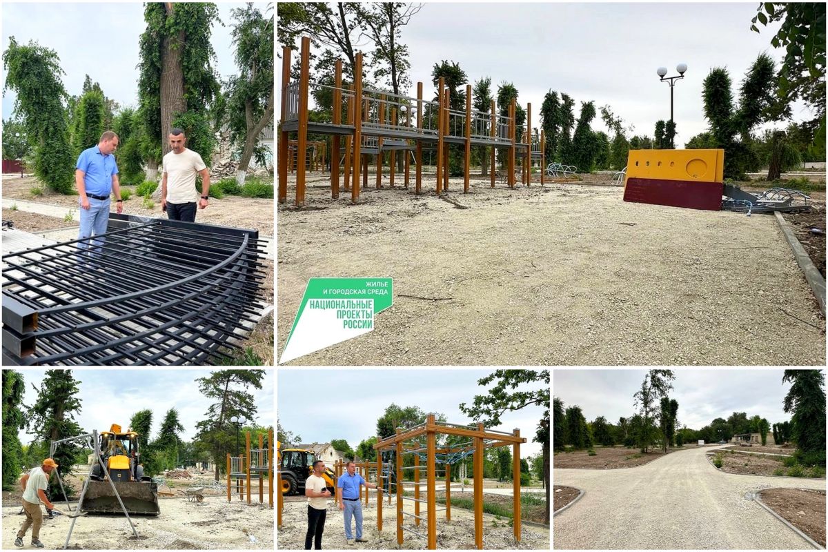 На объекте уже установлен бордюрный камень, фонари, подготовлено основание под укладку асфальта, начат монтаж элементов на площадках, завезено ограждение. Работы выполнены ориентировочно на 55 %. В парке предполагается обустройство зон отдыха, установка лавочек, урн.