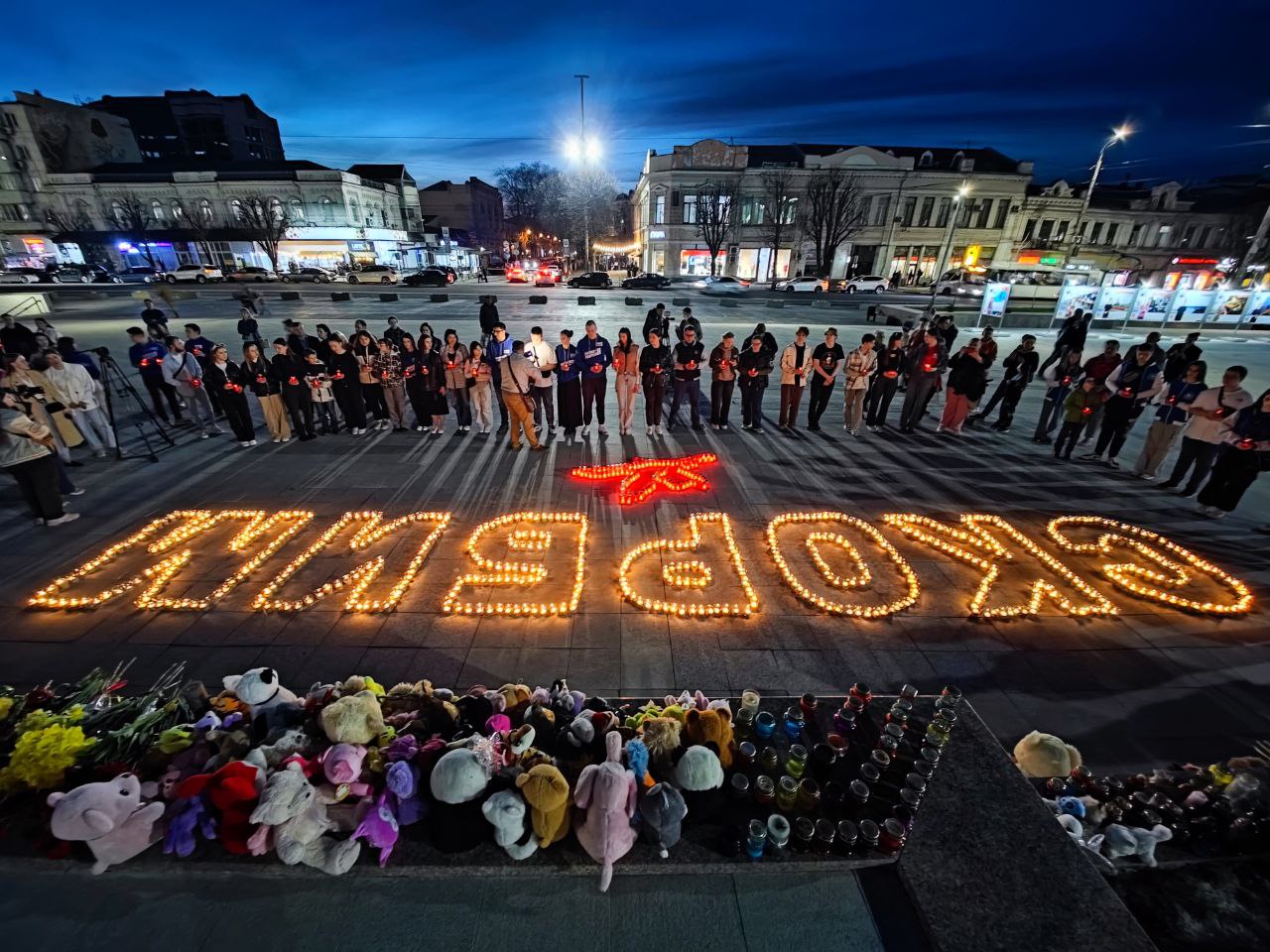 В Симферополе на площади Ленина состоялся стихийный митинг в память о погибших в ужасной трагедии в «Крокус Сити Холле». Представители молодежных организаций, студенты и школьники зажгли свечи, образуя из них слово «Скорбим» и журавля, в знак памяти о погибших.