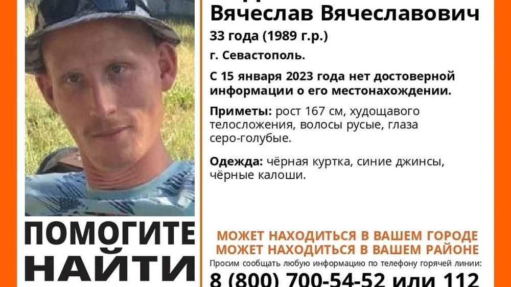 - Пропал Ведяшкин Вячеслав Вячеславович, 33 года (1989 года рождения), город Севастополь, - такую ориентировку разместили в соцсети волонтеры отряда «ЛизаАлерт» Крым.