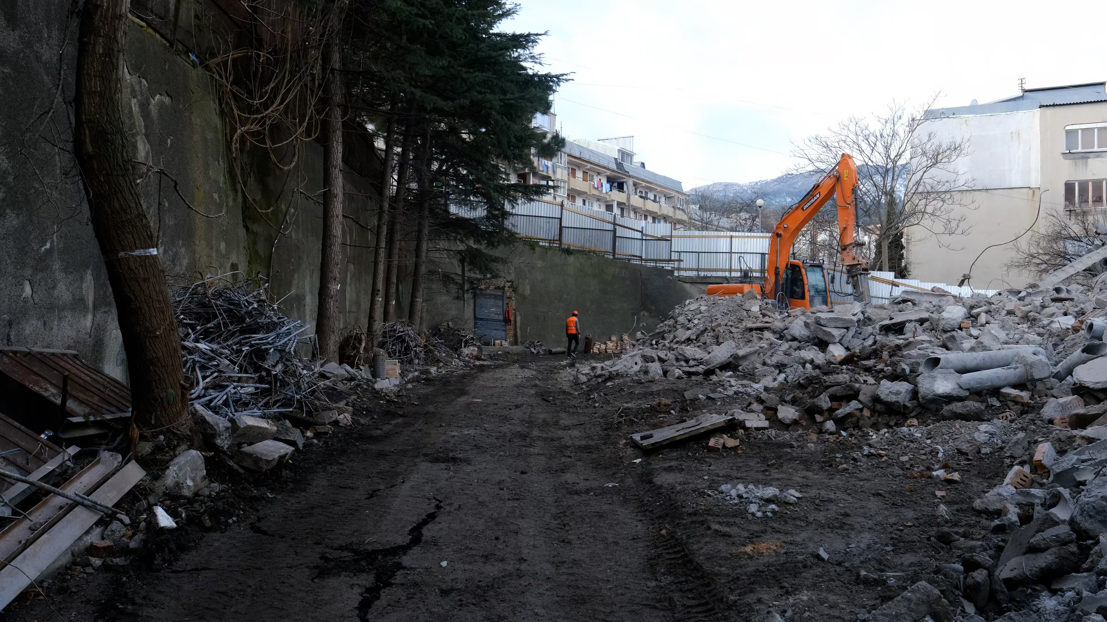 Сейчас проходит демонтаж основного здания. После этого подрядчик приступит к работам по устройству площадки и инженерной защите участка.